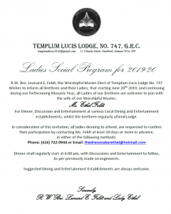 R.W. Bro. Leonard E. Feldt, the Worshipful Master Elect of Templum Lucis Lodge No. 747 wishes to inform all Brethren and their Ladies, that starting June 20th 2019, and continuing during our forthcoming Masonic year, all Ladies of our brethren are welcome to join with the wife of our Worshipful Master